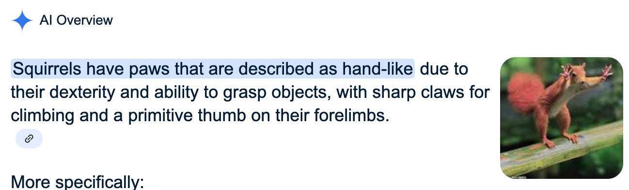 Maybe the internet is about to get so AI-slop, bot-heavy that we’ll all return to the sea. I need an adult to monitor my screentime. I not only need to touch grass, I need to clutch grass, I need to roll down a hill like a squirrel in a car tire with fistfuls of grass in each squirrel hand. Hand? Paw? Do they have paws?