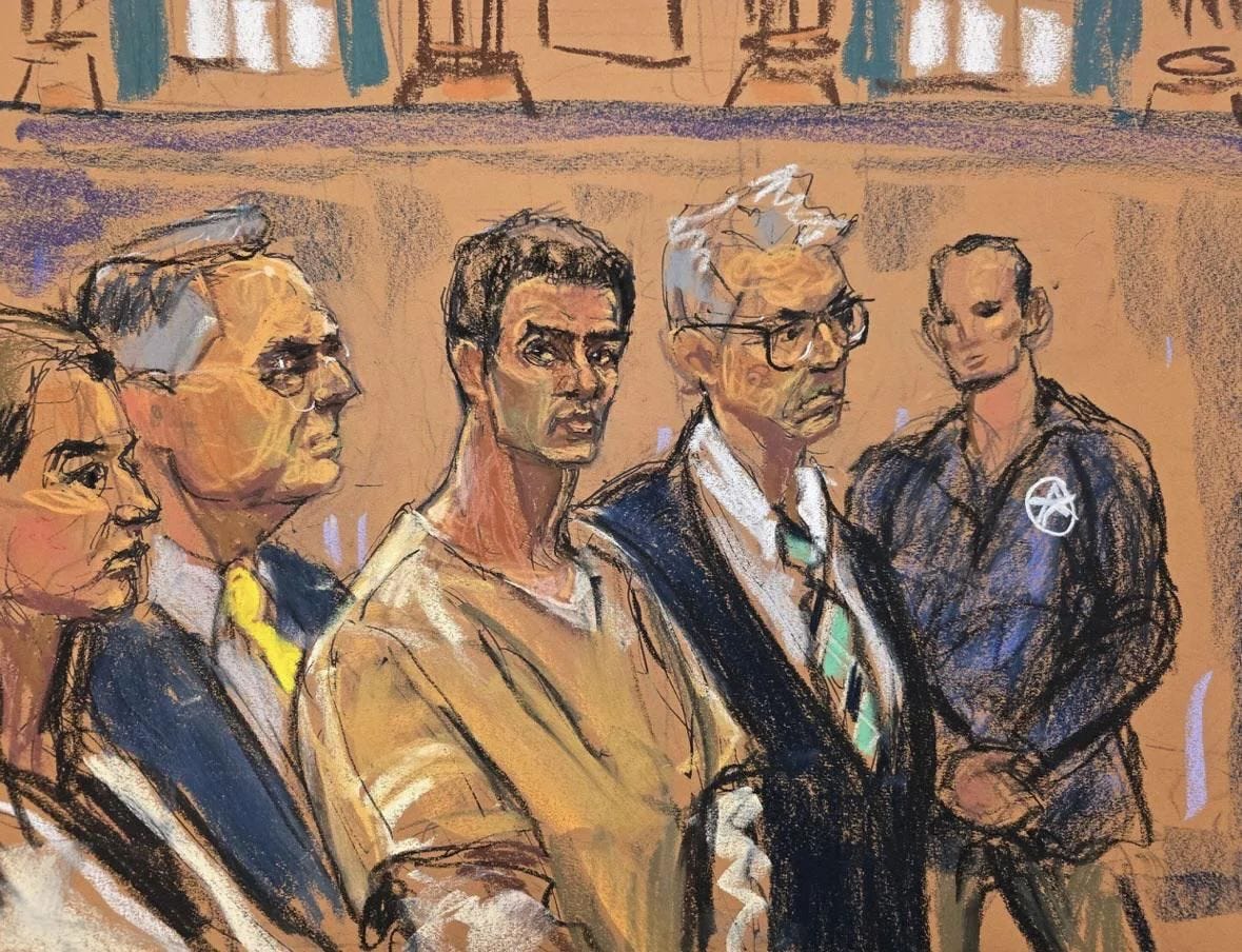 This courtroom sketch of Luigi Mangione. I feel bad about how hard I laughed when I first saw it, this man’s not even had a trial, and Trump’s administration has already painted him guilty and ordered the DP, all serious and scary but why is his head so small and his neck so swoll!!!!!?????/